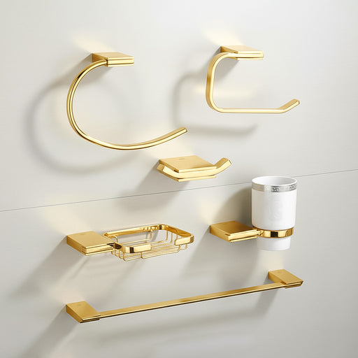 طقم إكسسوارات 6 قطع G 4500 بفواطة مستطيلة 58 سم وصبانة 15 سم و حامل كأس فرش أسنان و علاقة مزدوجة و فواطة دائرية و وراقة بمجموعة التثبيت اللون ذهبى من دريم