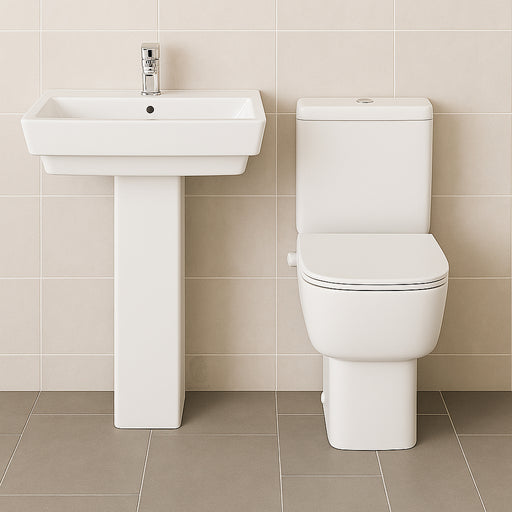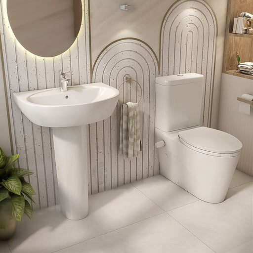 Lecicoبالطلبطقم حمام متكامل من ليسيكو موديل تريند ملاصق للحائط، يتكوّن من حوض بالعامود الطويل FS1RT01B ومرحاض كامل FS160210، باللون الأبيض وبخامات عالية الجود...