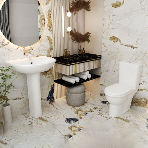 Lecicoبالطلبطقم حمام متكامل من ليسيكو موديل جلاكسي ملاصق للحائط، يتكوّن من حوض بالعامود الطويل FS18501B ومرحاض كامل FS185211، باللون الأبيض وبخامات عالية الجو...