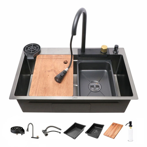 حوض مطبخ سمارت لوتس 46 × 75 سم بخلاط شداد 3 نظام وخلاط شلال وحنفية فلتر وضاغط صابون ومغسلة أكواب وحوض للنقع وسلة للتصفية ومجموعة الصرف 3 بوصة اللون اسود