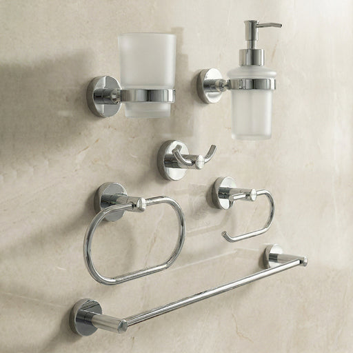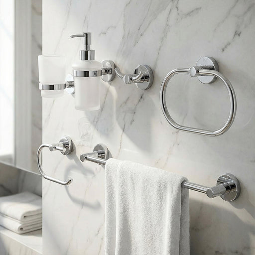 Infinityبالطلبطقم إكسسوارات IN1510B عدد 6 قطع. فواطة مستطيلة. فواطة دائرية. وراقة مربعة. صبانة. علاقة مزدوجة. كأس فرش اسنان زجاجى بحامل من الا ستانلس ستيل. ا...