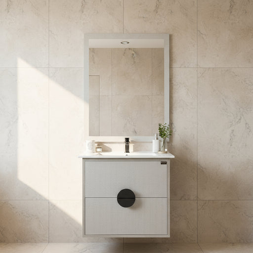 ( طلب مسبق ) وحدة حمام فيرو Vero لحوض مقاس 60 × 50 سم بالمرأة الوحدة مصنعة بخشب كونتر معالج بعازل HPL المقاوم لبخار المياة بدرج و فراغ من دوفو