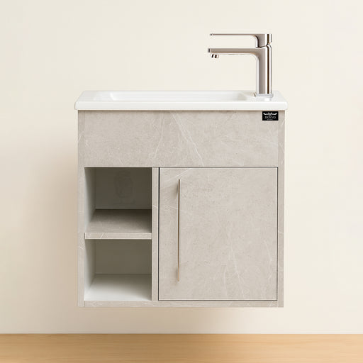 ( طلب مسبق ) وحدة حمام أونو UNO لحوض مقاس 50 × 30 سم بدون المرأة الوحدة مصنعة بخشب كونتر معالج بعازل HPL المقاوم لبخار المياة بضلفة و فراغين من دوفو